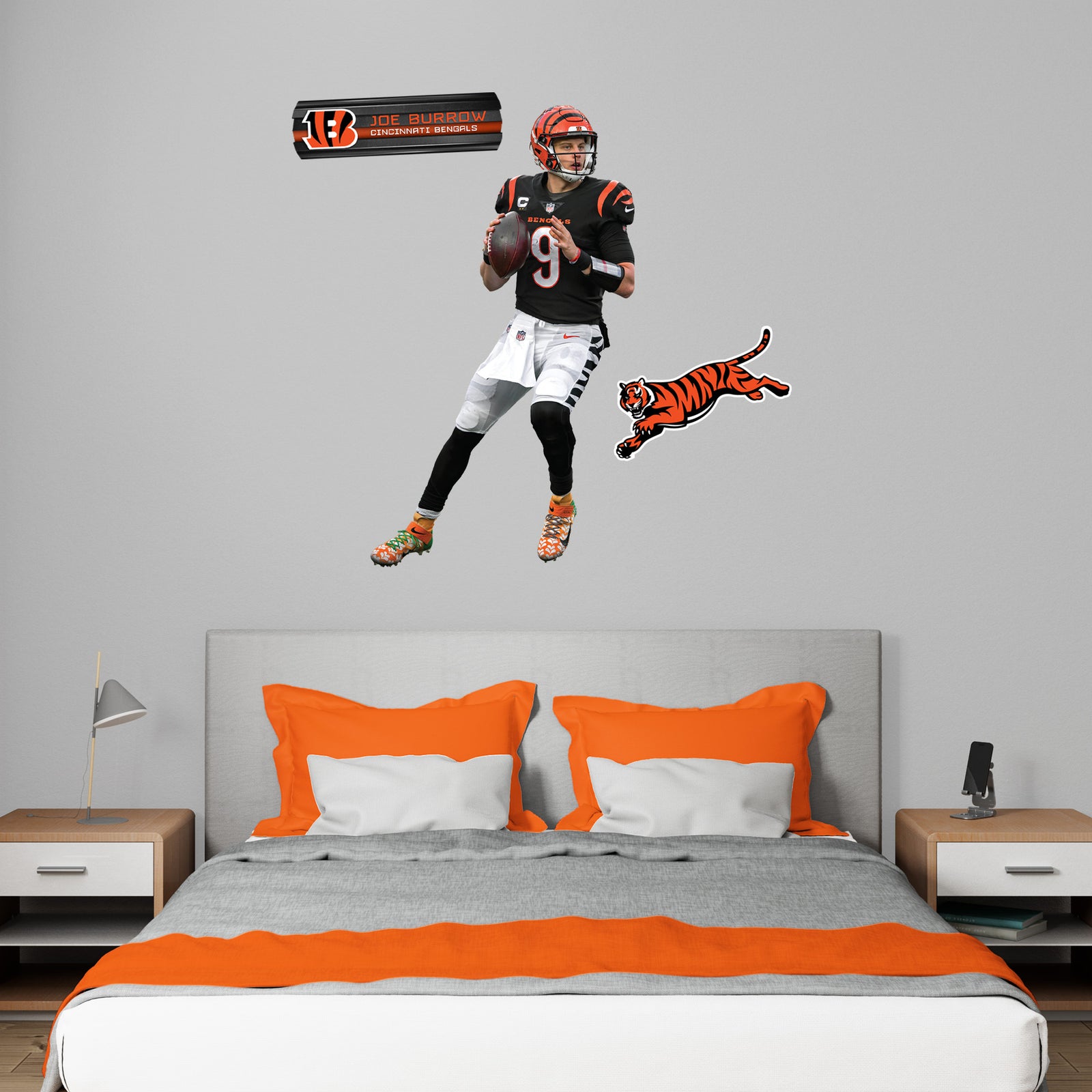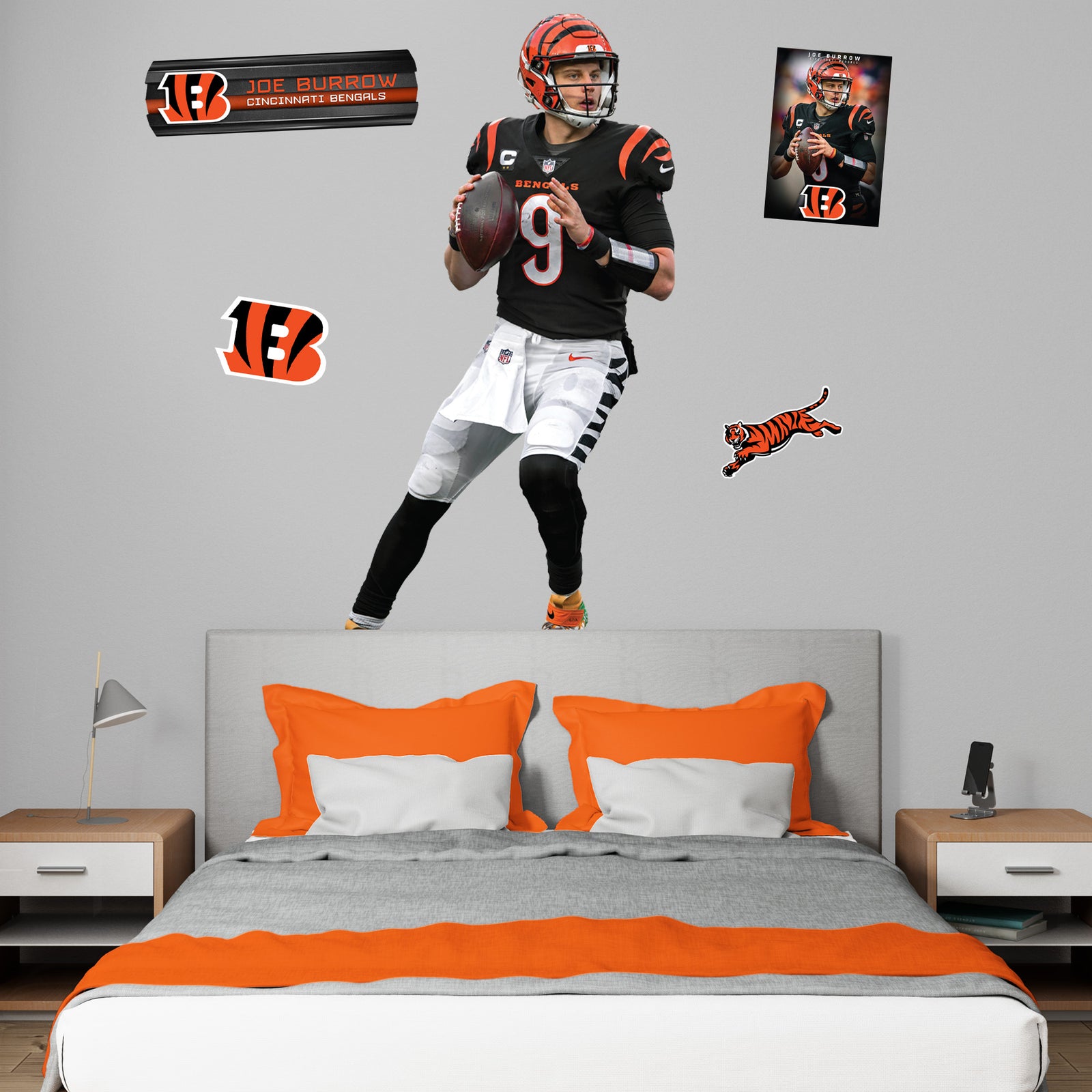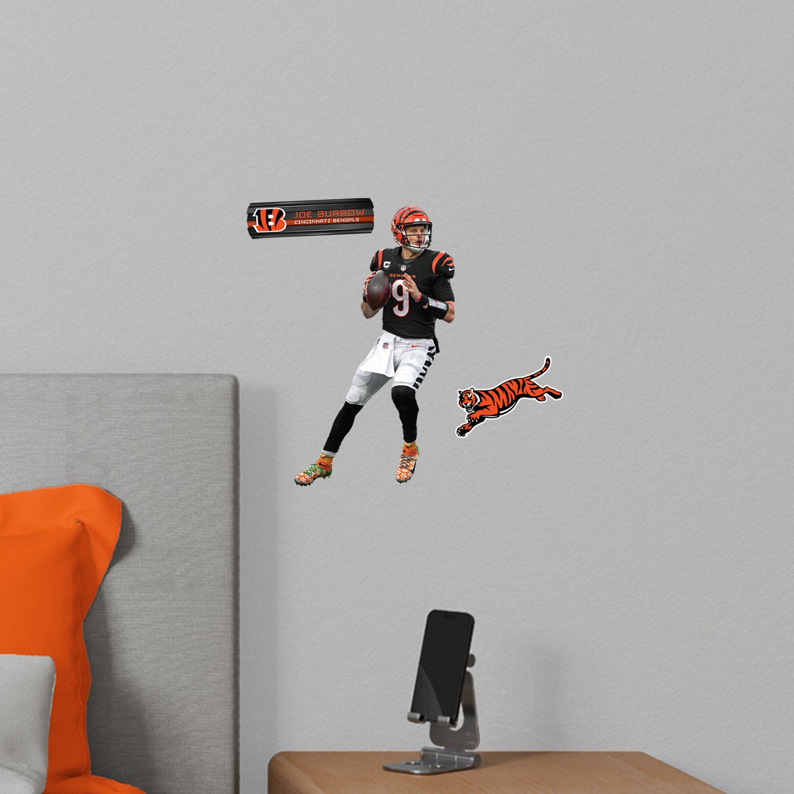 Transform your space with the Joe Burrow RealBig Collection - Official NFL Cincinnati Bengals Reusable Vinyl Wall Decals. Perfect for die-hard fans, these decals let you showcase your Bengals pride vividly on any wall. Made from premium vinyl, each decal is crafted to resist scratches and fading, ensuring vibrant colors that stay true over time. The precision die-cut edges deliver a seamless look, making your room feel like an extension of the field.